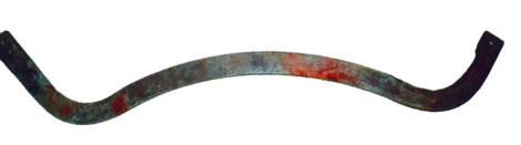 E. Measures 47 inches and is 3/8 by 2 inches thick. Span of inside curves – which are sharpened – measures about 32 inches. One bolt hole on the left and two on the right.