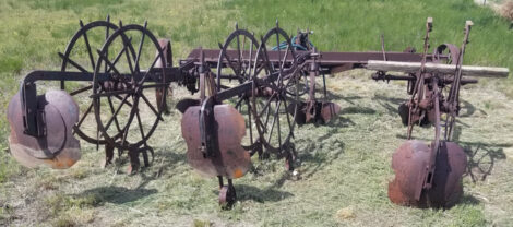 Unidentified. Willie Nurnion, Billings, Mont., believes it to be a diker wheel for a basic lister. “This International Harvester model makes a dike every 14 inches in the lister track,” Willie says. “The left diker is in dump position, the middle diker is in transport and the right diker is in workin position.” Photo submitted by Jim Christman via email.