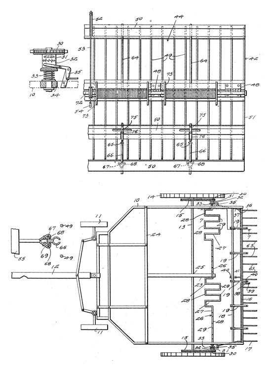 But it wasn’t finished yet. Realizing moving huge round bales weighing hundreds of pounds required another machine: a “Hay Stacker and Loader,” as described in his patent applied for January 19, 1929. The patent was allowed June 10, 1930. In his patent application no. 1,762,459, he described it: “This invention relates to…stacking hay and bales and loading the hay, … adapted either for use in the open, in a barn, or on a wagon. The general object … is to provide a very simple, readily operated and cheaply constructed loader and stacker which may be operated either by motor or by hand power … Also … to provide a (very simple) mechanism…whereby it may be controlled and the boom swung around in a circle and the bale raised or lowered as needed.”