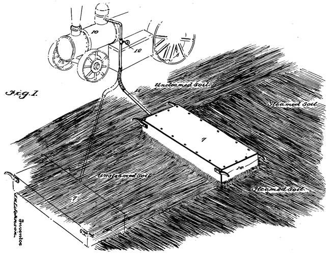 There was also a device called a burner. It had a set of wheels on one end and handles on the other. It was about 8 feet long and 3 feet wide, and consisted of a pan-like piece of metal with an opening on the end, where the wheels were located, for the smoke to come out. A fire was built under it and the loose dirt was shoveled up on the burner and cooked and then shoveled off the burner and put back on the plant bed.