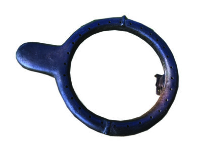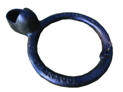 Spring Cooler milk can cooler, manufactured in Argus, Ind., probably designed for use on farms without electricity. Cup-like spout designed to fit over the spout of a hand-operated water pump. The bottom side of the circle has a series of holes like a sprinkler. Water from the pump circulated through the circle, showering the milk can with cold water, cooling the can’s contents.