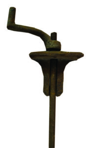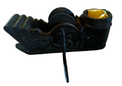 Antique Japanese ink snap-line tool. “A string is wound up on the reel using the crank handle,” he explains. “The string is fed out through a hole in the front through a sponge that is soaked with ink. To make a mark on a piece of lumber, the user pulls the line out through the sponge, holds the line taut, pulls it up and snaps it. This leaves a nice, neat, inked straight line as a guide in sawing. The string is then rewound on the reel to prepare for the next use.