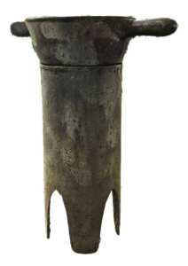 B. Found outside a St. Paul, Ore., farmhouse. Made of cast iron. Piece measures about 18 inches tall. Measures 16 inches wide (including handles) at the top. Opening at top measures 9 inches across.