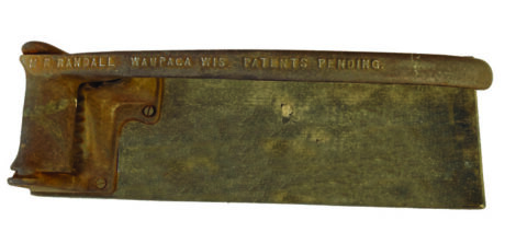 C. Tool is mounted to a plank measuring roughly 16 by 4-1/2 inches. Cast into long handle: M.R. RANDALL WAUPACA WIS. PATENTS PENDING.