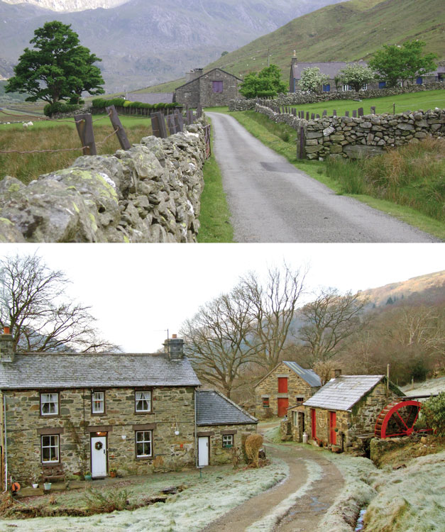 The thousands of miles of dry stone walls that stretch across our landscape were built to mark boundaries and to control livestock, but they also illustrate the U.K.’s diverse geology, for each region has different types of stone. A farm wall in Derbyshire, for instance, looks quite different from a wall in North Wales. One thing that’s obvious when looking at any of these dry stone walls is that an enormous amount of work went into building them. Some walls wind their way up mountainsides in great long stretches, and others border small fields, making the landscape look like a beautiful patchwork when viewed from above. These walls were built as a community effort, involving large numbers of workers.