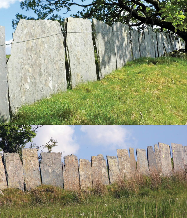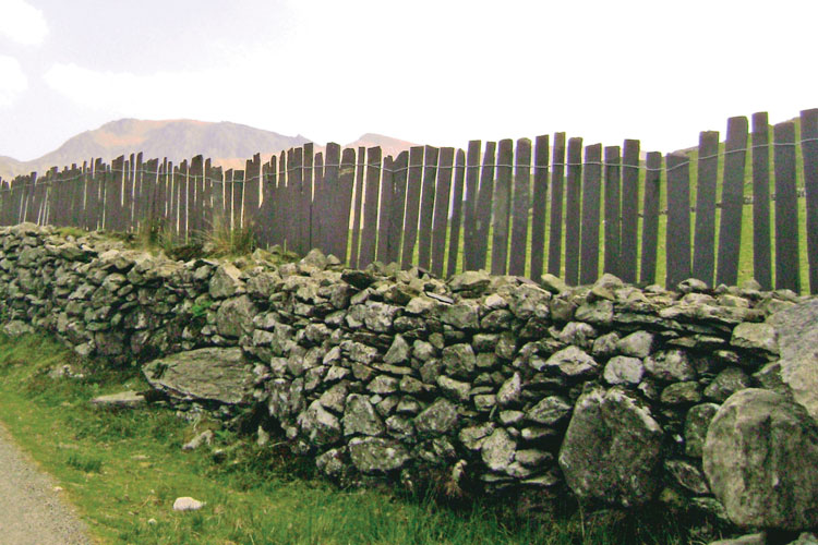 Most old slate fences that we see here in North Wales are made from long narrow strips of slate, but there are a few I’ve seen made from large slabs of slate. These stand majestically, almost like lines of gravestones, as durable monuments to past times and hard times, standing up to the harsh weather, and still, after well over a century, sheltering our Welsh Mountain sheep.