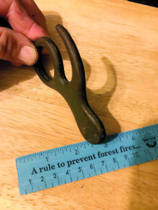 Answer: Device used to hold mail bags open in a post office sorting area. The eye opening slid over a horizontal pipe anchored to a wall or counter. The back side of the bag was hooked over the thumb-like prong, allowing the bag to hang fully open, making a larger opening in which to toss envelopes. Identified by Virgil Cassill, Drakesville, Iowa, and Vickie Henrichsen, Sioux City, Iowa. Photo submitted by Bradley Anderson, Albion, Neb.