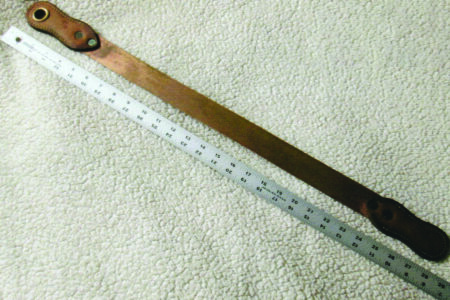 Unidentified. Likely a sweat scraper used on horses Photo submitted by Steven Sylvester, Centuria, Wis.