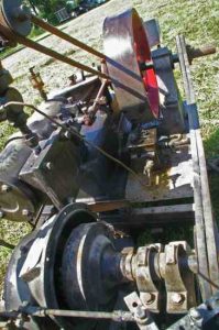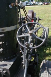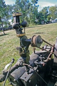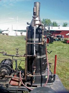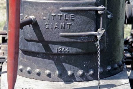 Russ’s steam-driven creation is an unusual machine to see at a farm show (or anywhere, really). A homemade device cobbled together with disparate parts, it uses the frame of a Model T auto, wheels from a Ford Falcon (adapted to make the rims fit), front and rear Model T axles (cut and narrowed), a jackshaft to reduce the speed of the 1935 Plymouth transmission, a Rockford twin-disc clutch off a 4-cylinder Wisconsin engine, a Model T steering wheel and emergency cable handbrake, and a Little Giant steam boiler (serial no. 1244), manufactured by C.H. Dutton Co., Kalamazoo, Mich., dating to about 1925.