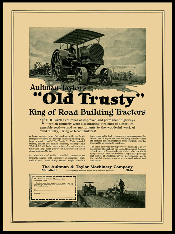 In 1910, Aultman & Taylor saw the writing on the wall and introduced their gas-powered tractor known as “Old Trusty.” Old Trusty was its massive Model 30-60 that went into production in 1911. The tractor gained a well-deserved reputation for reliability and performance.